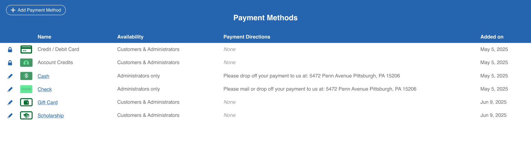 Or, if you offer your students dollar-based scholarships, you can create a new custom payment method called "Scholarship", enable balance tracking on it, and track any funds you give them to apply to their registrations.